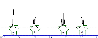 У спектрі повинно спостерігатися накладання сигналів цих структурних фрагментів. В наведеній вище таблиці містяться три з них (відповідно рядки 18, 20 та 2). Якщо в спектрі сполуки знайти сигнали, що за формою мультиплетів близькі до тих, що наведені у таблиці, то можна ідентифікувати основну кількість сигналів. При цьому віднесення синглету метиленової групи, що міститься в спектрі на додаток до них, не становитиме проблеми. При порівнянні спектру з табличними даними завжди слід пам’ятати, що можливі відхилення в положеннях сигналів від табличних величин, які зумовлені наявністю електронодонорних чи електроноакцепторних замісників. Тому на першому етапі аналізу спектру слід звернути увагу лише на форму мультиплетів, а вже потім проаналізувати, чи наявні в молекулі структурні особливості узгоджуються з відхиленнями хімічних зсувів від табличних даних. Слід зауважити, що така інтерпретація спектру є простою лише в тому випадку, коли сигнали одних структурних фрагментів не співпадають повністю з сигналами інших фрагментів. Якщо виникає така ситуація, то вигляд спектру може докорінно змінитися – замість чітких піків з видимою мультиплетністю в спектрі можуть з’явитися складні сигнали невизначеної форми, які мають інтегральну інтенсивність в декілька протонів. Особливості інтерпретації таких складних спектрів будуть пояснені у наведених нижче прикладах, де розібрані декілька варіантів аналізу спектрів, що є найбільш поширеними.