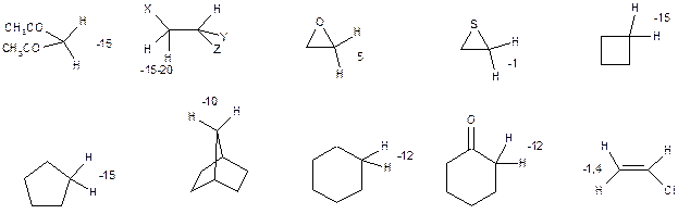 Це константи 2JHH. Вони найчастіше трапляються у фрагменті СН2 і мають величини в інтервалі від — 23 Гц у молекулі циклопентадієну до + 41Гц у молекулі формальдегіду. Як бачимо, діапазон даних КССВ є досить великим, причому може змінюватися не тільки видима величина 2JHH, а й її знак. Тому може трапитися парадоксальна ситуація, коли збільшення величини КССВ може приводити до її зменшення. Так, наприклад, збільшення 2JHH від -10 Гц до +2 Гц візуально сприйматиметься як зменшення величини даної КССВ на 8 Гц. В цілому великі негативні значення гемінальних КССВ є більш характерними, тому, якщо у сполуці відмічено велику гемінальну КССВ, то з високою вірогідністю вона має негативний знак. Коли ж гемінальна КССВ є невеликою, то вона може бути як позитивною, так і негативною. Нижче, на рис. 3.8 наведено типові значення гемінальних КССВ для органічних сполук різноманітної будови.
