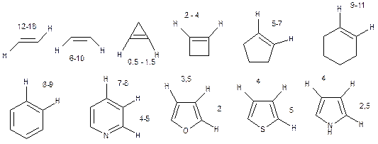 В ароматичних сполуках величини віцинальних КССВ визначаються розмірами циклу та наявністю у ньому гетероатомів. Збільшення розміру циклу зумовлює збільшення величин віцинальних КССВ. Так, для п'ятичленних циклів характерними є КССВ 4-6 Гц, для 6-членних – 7,5-8,5 Гц, а для 7-членних – 10-12 Гц. Нижче, на рис. 3.10 наведено величини віцинальних КССВ для поширених фрагментів органічних сполук.