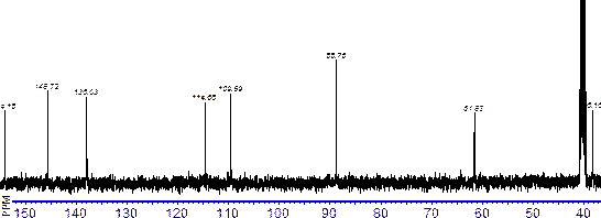 Спектр 13С, в розчині ДМСО, сигнали в м.ч. відносно ТМС: 154,2; 146,7; 138,0; 114,7; 109,6; 88,8; 61,5; 38,2. Тут, на відміну від описів протонних спектрів, не вказуються віднесення сигналів, їх відносні інтенсивності та величини КССВ, а наводиться лише перелік хімічних зсувів.