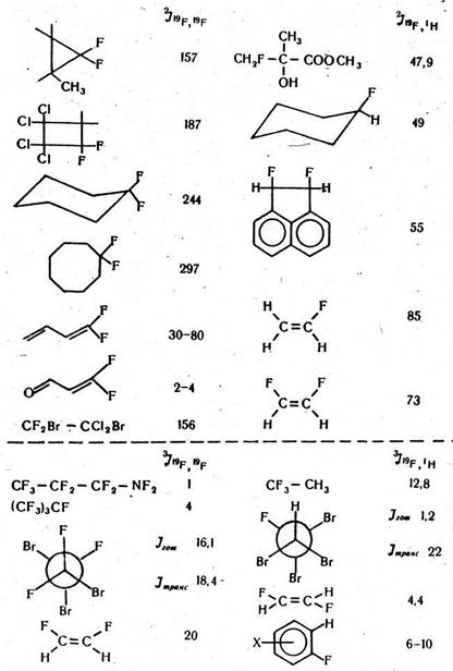Величини КССВ JFH i JFF також мають певні особливості, вони можуть набагато перевищувати відповідні константи JHН (див. формули відповідних сполук). Найбільші величини мають гемінальні КССВ (до 300 Гц). Інші КССВ, як правило, значно менші. Цікавим тут є той факт, що величини 3JFFтранс значною мірою, іноді в 10 разів, перевищують відповідну константу 3JFFцис У спектроскопії фтору слід також враховувати, що спін-спінова взаємодія тут, на відміну від взаємодії протонів, може передаватися не тільки по зв'язках, а й через простір у разі зіткнення електронних оболонок атомів фтору. Тому, якщо в молекулі органічної сполуки атоми фтору розташовані на відстанях, менших, ніж сума їх вандерваальсівських радіусів, то між такими атомами можуть спостерігатися дуже великі КССВ навіть у тому випадку, коли атоми, що взаємодіють, розділені 5—6 хімічними зв'язками. Типові значення констант JFH таJFF наведені на рис. 64 разом з формулами відповідних сполук.