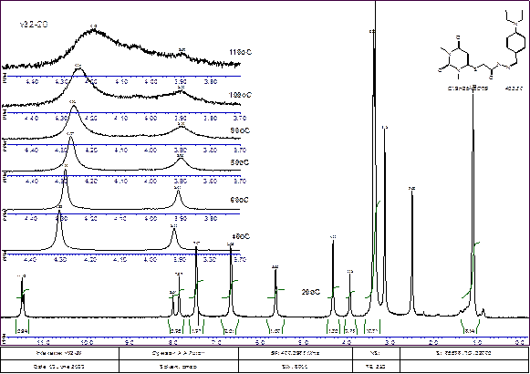 або виникнення просторових перешкод для обертання навколо простого зв’язку. Цілком аналогічно цьому у багатьох спектрах амідів та гідразидів можна побачити ознаки динаміки. Такі спектри або мають подвоєний набір певних сигналів, або аномальні уширення сигналів, що змінюються зі зміною температури вимірювання спектру. Нижче для прикладу наведено спектри одного з гідразидів, які виміряні при різних температурах і записано так, щоб з них можна було знайти залежність ширини сигналів від температури. На додаткових розгортках спектру показано область поглинання метиленових протонів при різних температурах. Зі спектрів видно, що збіг сигналів відбувається при 110оС. Ширина сигналів в обраному температурному інтервалі змінюється від 5 до 100 Гц, що цілком достатньо для розрахунку термодинамічних параметрів обмінного процесу. Як витікає з оглядового спектру, спостерігається подвоєння сигналів всіх протонів, що розташовані поблизу гідразидного фрагменту. Відстань між сигналами метиленових протонів двох конформерів сягає 0,4 м.ч. Розгляд інтенсивностей сигналів показує, що в даному випадку населеності конформерів сильно відрізняються одна від одної. Це пов’язано з наявністю різних просторових перешкод у кожному з конформерів. Слід, однак, відмітити, що співвідношення конформерів у динамічних системах не є сталою величиною. Воно часто змінюється при вимірюванні спектрів в іншому розчиннику. Цю властивість мають і гідразиди. Так, розглядуваний спектр в дейтерохлороформі мав би зовсім інше співвідношення конформерів.