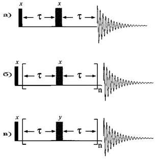 Рис. 4.9. Послідовність спінової луни для вимірювання часу релаксації T2. (a) Базова послідовність спінової луни, (б) послідовність Карра-Парсела і (в) послідовність Карра-Парсела-Мейбаума-Жилла (CPMG).