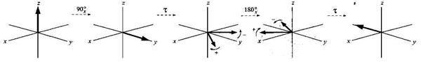 Вимірювання істинного часу поперечної релаксації Т2 у принципі можна здійснити, якщо видалити внесок у релаксацію неоднорідності магнітного поля. Як було показано у 1 розділі, це можна здійснити за допомогою послідовності спінової луни. Уявімо собі, що досліджуваний зразок можна розділити на мікроскопічні області, у межах яких неоднорідність поля відсутня. Вектори намагніченості ядер у межах таких областей будуть мати однакові частоти прецесії. При дії базової послідовності спінової луни (Рис. 4.9а) вектори намагніченості в одних областях за час періоду t рухаються з випередженням, інші ж за цей час трохи відстають (Рис. 4.10).