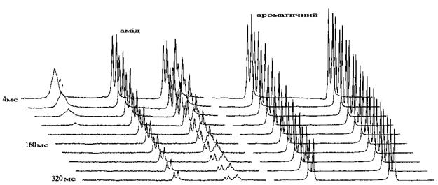 Рис. 4.13.CPMG спектри пентапептиду Leu-енкефаліну 4.3в DMSO. Дуже швидкий спад слабопольного сигналу амідного протона відбувається через його участь у швидкому хімічному обміні з водою, внаслідок чого сигнал є сильно уширеним. Числа відповідають часу релаксації T2 .