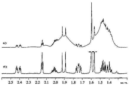 Рис. 4.14.Т2 фільтр. Широкий сигнал полістиролу (Mr = 50,000) в (a) усунутий в (б) за допомогою послідовності CPMG. При цьому в спектрі залишаються тільки сигнали менших за розміром молекул камфори. Затримка t становила 1.5 мс і луна була повторена 150 разів для того, щоб сумарний період релаксаційної затримки становив 450 мс.