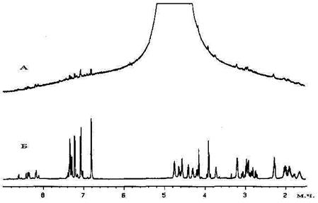 Рис. 4.15.Ослаблення сигналу розчинника методом WATR. (a) одномірний протонний спектр 8м розчину відновленого аргінін - вазопресину в 90% H2O/10% D2O, pН = 2.75 утримується за допомогою 0.2 M NH2OH. (б) Такий же зразок записаний з послідовністю CPMG із сумарною затримкою 235 мс