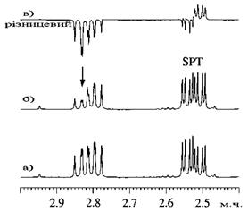 Рис. 4.19.SPT артефакти. Нерівномірне насичення компонентів мультиплету сигналу (б) може бути причиною появи SPT викривлень інтенсивності на його J-розщеплених сусідах. Артефакти з'являються як протифазні сигнали в різницевому спектрі б-a (в). Артефакти мають нульову загальну інтенсивність, але можуть маскувати сигнали ЯЕО