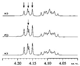 Рис. 4.20.Селективне насичення мультиплету за допомогою частотного циклу, (a) Контрольний спектр, (б) одинична частота, малопотужне переднасичення прикладене до центра мультиплету і (в) переднасичення такої ж сили але із частотним циклом по чотирьох лініях. Маленька потужність забезпечує селективність насичення