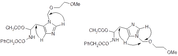 Визначення положення замісника за відсутності ССВ також може бути предметом вивчення за допомогою ЯЕО. Особливо часто проблема виникає при N-алкілуванні гетероциклів, що містять декілька атомів азоту. Експерименти ЯЕО дозволяють вирішити це завдання досить надійно. Гетероциклічні системи особливо зручні для таких досліджень, оскільки вони планарні і для вирішення задачі достатньо з'ясувати, який замісник розташовується поблизу від алкілованого атома азоту. Ілюстрацією цьому є з'ясування будови заміщених гістидинів 4.9а й 4.9б. Для ізомеру 4.9а при опроміненні протона Н5 зростає інтенсивність тільки сигналу метиленової групи, що пов'язана з імідазольним кільцем. У той самий час, для ізомеру 4.9б зростає інтенсивність сигналів обох метиленових груп. Знайдені ЯЕО вказані на формулах стрілками. Зверніть увагу на те, що в даному випадку не вказані величини ЯЕО у відсотках. Саме так наявність ЯЕО подається у більшості публікацій. Це пов’язано з тим, що для того, щоб знайти кількісні ЯЕО треба виконати цілий рад умов і докладно описати методику проведення експерименту. Між тим, для вирішення конкретної структурної проблеми такий підхід є зайвим – достатньо виявити саму наявність ЯЕО між відповідними протонами. З цією метою можна використовувати як стаціонарні різницеві методики, так і нестаціонарний метод NOESY-1D. Результати при цьому у більшості випадків будуть майже однаковими.