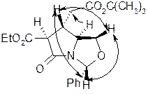 Насичені біциклічні сполуки здебільшого є неплоскими. Це зумовлено тим, що хімічні зв’язки в таких сполуках орієнтуються під кутом, близьким до 109о. Тому анелювання циклів також відбувається під таким самим кутом. Таким чином, біциклічна сполука за своєю формою нагадує відкриту двохствірчасту раковину з тупим кутом між ствірками. Якщо по периметру молекули містяться замісники, вони можуть буті спрямовані всередину такої „раковини”. Такі сполуки називають ендо-аддуктами. Якщо ж замісник спрямований назовні, то ізомер називають екзо-аддуктом. Вибір між екзо- і ендо-аддуктами в конденсованих циклічних системах зручно проводити за допомогою ЯЕО. Одним із прикладів цьому може бути встановлення конфігурації замісників при С5 лактаму 4.12.