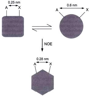 Варто також уважно ставитися до поняття між’ядерної відстані. У реальних молекулах відстань між спінами може постійно змінюватися внаслідок конформаційних рухів. Тому в результаті розрахунків ми можемо отримати лише усереднену величину. Більше того, при наявності конформаційної рухливості внесок конформації з максимально зближеними ядрами може виявитися завищеним, оскільки ЯЕО для такої конформації є набагато більшим внаслідок залежності від r-6. Розглянемо випадок швидкого, у шкалі часу ЯМР, обміну між двома рівнонаселеними конформерами, коли в спектрі є єдиний сигнал, що відповідає двом нееквівалентним станам спіна. В одному з конформерів відстань між спінами, r1, становить 0,25 нм, а в другому, r2, – 0,6 нм (Рис. 4.25). Усереднена величина ЯЕО за умов швидкого конформаційного обміну становить (r1-6 + r2-6)-1/6. Тому розраховане на підставі величин ЯЕО значення r становить 0,28 нм, а не 0,42 нм, як цього слід було очікувати.