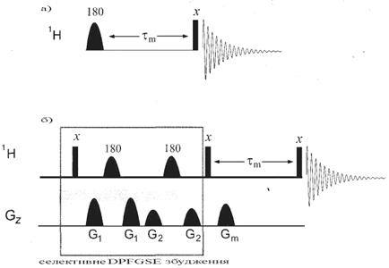 Рис. 4.26.Схеми ID NOESY. Базова схема (a) вимагає для виявлення ЯЕО застосування різницевої спектроскопії, тоді як метод із градієнтним відбором DPFGSE-NOE (б) дає можливість одержати ЯЕО без викривлень, пов'язаних з різницевими артефактами.