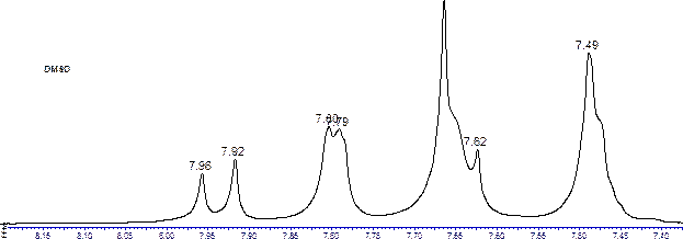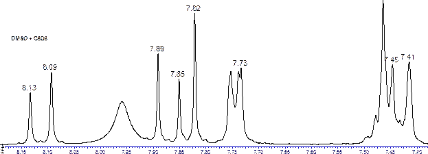 видно з наведених нижче спектрів (Рис. 4.40). Якщо у чистому ДМСО сигнали, що можуть підтвердити структуру сполуки співпадають з інтенсивними сигналами фенільного замісника, то при додаванні до розчину рівного об”єму дейтеробензолу всі сигнали речовини спостерігаються окремо і структура сполуки надійно підтверджується. Слід зазначити, що чим більшою є робоча частота спектрометру, тим ефективнішим є метод ЗІАР. Принадою методу є повна відсутність уширень сигналів і простота експерименту. На відміну від застосування ЛЗР, в даному випадку не виникає потреби вимірювання декількох спектрів та проводити розрахунки ЛІЗ. Таким чином, якщо у виміряному Вами спектрі цінні сигнали співпадають з іншими піками, слід перш за все спробувати для інтерпретації спектру використати ефект ЗІАР, а лише при його неефективності застосовувати більш трудомісткі методики.