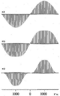 Рис. 4.44.Обчислені профілі збудження для (a) послідовності стрибка з поворотом, біноміальних послідовностей (б) 1-1 і (в) 1-3-3-1. Послідовність стрибка з поворотом використовує t= 250 ms, а біноміальна послідовність використовує t = 500 ms