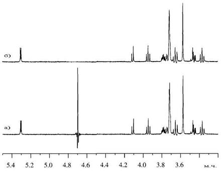 Рис. 4.46.Придушення розчинника за схемою нульового збудження . Зразок - 2 м сахароза, в 9:1 H2O: D2O. В (б) маленький залишковий сигнал розчинника повністю вилучений за допомогою додаткової обробки СВІ