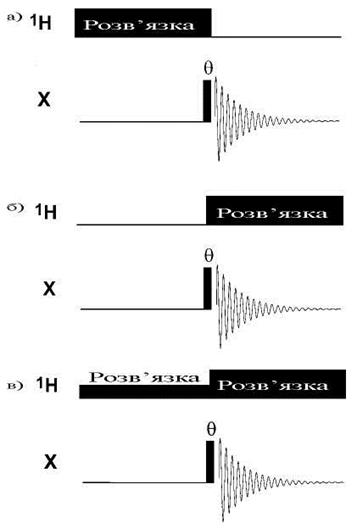 Рис. 4.47. Можливі схеми протонного декаплінгу при спостереженні гетероядер. (a) переривчастий декаплінг (розщеплений спектр із ЯЕО), б) обернений переривчастий декаплінг (розв'язаний спектр без ЯЕО) і в) декаплінг зі змінною потужністю (розв'язаний спектр із ЯЕО).