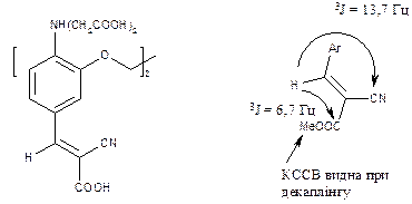 Протон-вуглецеві КССВ через один зв'язок мають величину порядку 100 Гц і за допомогою селективного декаплінгу подавити їх досить важко. Тому для вирішення таких проблем зазвичай використовуються двомірні гетероядерні кореляційні спектри. Селективна розв'язка протон-вуглецевих ССВ через 2-3 хімічних зв'язки більш реальна, оскільки величини ССВ у цьому випадку не перевищують 10 Гц. Прикладом цьому є встановлення конфігурації ізомерів сполуки 4.26. за допомогою визначення величин КССВ через 3 зв'язки між олефіновим протоном та вуглецевими атомами нітрильної та карбонільної груп (Рис. 4.49). У цьому випадку залежність КССВ від діедрального кута близька до Карплусової. Тому величина розщеплення сигналів вуглецевих атомів нітрильної і ефірної груп визначається їхньою орієнтацією відносно олефінового фрагменту. Достатньо знайти, яка з КССВ більша, щоб з’ясувати, яка група знаходиться у транс-положенні відносно олефінового протона. Сигнал нітрильної групи в спектрі має вигляд дублету і його КССВ можна знайти безпосередньо зі спектру, а КССВ сигналу СО маскується розщепленням на метилі. Селективне придушення на частоті метилу дозволяє визначити потрібну величину КССВ.