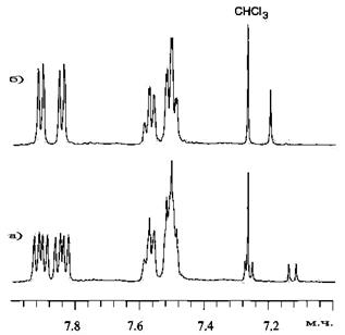 Рис. 4.50. Спрощення звичайного протонного спектру (a) фосфіну паладію4.27 в CDCI3 при використанні широкосмугового декаплінгу на ядрах фосфору, (б). Зі спектра зникли всі далекі КССВ 'H-31P. Найбільші зміни спостерігаються для сигналів протона алкену (7.2 м.ч.) іорто- протонів кілець фенілу ( 7.8 м.ч.)