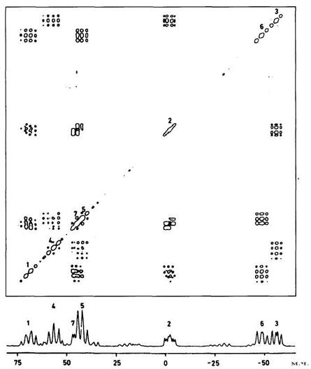Експеримент COSY не обмежується протонною спектроскопією. Він придатний для встановлення гомоядерних кореляцій між будь-якими спінами з високим природним вмістом. Найбільш часто він застосовується в спектроскопії на ядрах 19F, 31P, 11B. На рис. 5.14 вміщено спектр COSY 31P-31P, що був отриманий для сполуки Р7Ме5 5.3. Процедура віднесення сигналів тут є повністю аналогічною до тієї, котра була описана для протонів. У цьому випадку наявність біциклу між атомами фосфору Р-Р вдається довести на підставі наявності КССВ через два зв'язки між атомами Р2 і Р7.