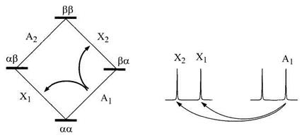 Рис5.28. Процес перенесення когерентності, що забезпечує виникнення кроспіків у кореляційній спектроскопії. Показаний для переходу А1. Когерентність спіна A, що виникає протягом інтервалу t1 2D послідовності, протягом t2 стає когерентністю спіна-X. Таким чином, у результуючому спектрі між зв'язаними спінами виникають кореляції.