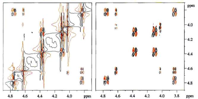 Рис 5.44. COSY спектр із двохквантовою фільтрацією (праворуч), забезпечує більш високе розділення піків, що близькі до діагоналі, ніж фазочутливий COSY (ліворуч), оскільки він не містить широких, дисперсійних діагональних піків