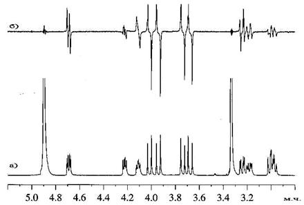 Додатковою перевагою фільтрації є те, що в спектрі не проявляються синглети, оскільки вони не здатні до формування двохквантової когерентності. Тому відпадають проблеми, що пов'язані з t1-шумом найбільш інтенсивних сигналів. Двохквантове фільтрування також виключає зі спектра піки розчинника, які звичайно мають виключно велику інтенсивність. При використанні фазового циклу ступінь послаблення піків розчинника може досягати декількох сотень. Якщо ж використовувати імпульсні градієнти, сигнали розчинника можуть бути ослабленими в 10000 разів. Редагування за допомогою фільтрації можна проілюструвати за допомогою 1D спектра із двохквантовою фільтрацією пептиду Leu-енкефаліну 5.4 у дейтерометанолі (Рис. 5.45), що отриманий за допомогою 1D послідовності, наведеної на рис. 5.43. Сигнал розчинника зі спектра вилучений, а спіново-зв’язані мультиплети мають характерну протифазну орієнтацію.