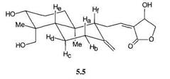 Навіть, якщо наявні дані і не дозволяють вимірювати константи взаємодії, аналіз відносних величин активних і пасивних констант може дозволити провести інтерпретацію спектра. Наприклад, у деяких випадках шляхом аналізу структури кроспіків можна визначити відносну конфігурацію протонів у заміщених циклогексанах. Оскільки аксіально-аксіальна спін-спінова взаємодія в конформації крісла є набагато більшою, ніж аксіально-екваторіальна або екваторіально-екваторіальна (акс-акс = 10-12 Гц, акс-екв і екв-екв = 2-5 Гц), вони дають велике протифазне розщеплення мультиплетів у кроспіках. Наявність його в спектрі вказує на діаксіальну орієнтацію протонів. Це показано на рис. 5.46, де наведено фрагмент DQF-COSY спектра андрографоліду 5.5, гепатопротектора, що міститься в традиційних індійських рослинних ліках. У кроспіку протона Нс присутні більші пасивні КССВ як з гемінальним (Hd) так і з діаксіальними (Ha, Hе) протонами і набагато менша активна константа із протоном Hb. Тому останній протон може бути як акс-екв так і екв-екв, але не акс-акс.