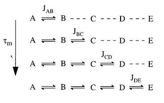 Рис. 5.56.Схематична ілюстрація поширення намагніченості уздовж ланцюга зв'язаних спінів як функція часу змішування спінового замка. Стрілочки означають циклічний обмін когерентності між ядрами
