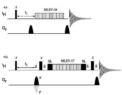 Для зразків, концентрація яких є достатньою для того, щоб вимірювати їхні спектри з одного скану, градієнтні різновиди TOCSY можуть виявитися особливо корисними для скорочення часу експерименту. За аналогією із проведеними вище обговореннями спектрів COSY, послідовність TOCSY в абсолютних значеннях вимагає розміщення однакових градієнтних імпульсів з обох боків послідовності спінового замка (Рис. 5.59а).
