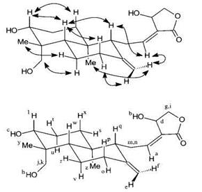 На Рис. 6.2. показаний набагато більш складний спектр NOESY природного терпену андрографоліду 6.2. у ДМСО. Нижче, на формулі сполуки представлена схема найважливіших просторових кореляцій, що можна дістати зі спектру. На рисунку знак піків виділений кольором. Позитивні сигнали позначено червоним кольором, а негативні – чорним. Видно, що більшість кроспіків мають знак, протилежний до знаку діагональних піків. Як це витікає з молекулярної маси молекули (М = 350), знак ЯЕО в цьому випадку повинен бути позитивним. У декількох кроспіків в області 3-6 м.ч. знак збігається зі знаком діагональних піків. Ці піки відповідають гідроксильним протонам і воді. Вони обумовлені протонним обміном.