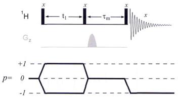 Рис. 6.3.Послідовність 2D NOESY і відповідний їй шлях перенесення когерентності. Переваги використання імпульсного градієнта поля (показано сірим) під час періоду змішування описані в тексті