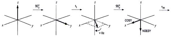 Послідовність NOESY (Рис. 6.3.) відрізняється від COSY тим, що в ній період змішування включає два 90о імпульси, розділені часовим проміжком tm, під час якого виникає ЯЕО. Для пояснення його ролі в експерименті ми скористаємося векторною моделлю (Рис. 6.4.).