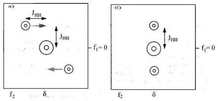 Використання необробленого J-розділеного спектра виявляється не дуже зручним, оскільки присутність спінових мультиплетів у вимірі f2 може привести до перекривання сигналів. Тому для того, щоб у вимірі f2 залишилися тільки хімічні зсуви, а КССВ були вилучені, можна провести математичну обробку двомірного масиву даних так, щоб нахилити мультиплети на 45о відносно їхніх центрів, як це схематично показано на Рис. 6.22.