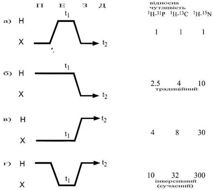 Рис. 6.30.Чотири основних схеми для одержання гетероядерного 2D кореляційного спектра. Порівняння відносних чутливостей цих методів наведено для експериментів по кореляції протонів з фосфором-31, вуглецем-13, і азотом-15