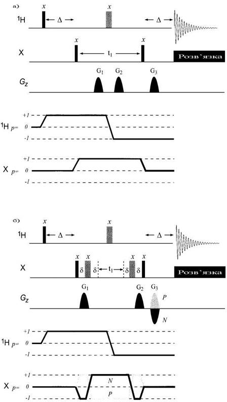 Рис. 6.38.Послідовність експерименту HMQC із градієнтним відбором. Послідовність (a) придатна для збору даних в абсолютних значеннях. Послідовність (б) забезпечує одержання фазочутливих даних за допомогою процедури луни-антилуни. Селекція шляхів N- і P-типу здійснюється за допомогою останнього градієнта. Перші два градієнти, що потрібні для рефокусування еволюції хімічних зсувів, розміщені усередині фрагмента спінової луни.