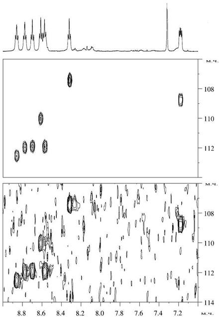 Імпульсні градієнти поля, безперечно, є найкращим методом придушення сигналів (Рис.6.37г). Ступінь ослаблення залишкового сигналу становить 1000:1 навіть у випадку одиничного скану. Це означає практично повне придушення вихідних сигналів 1Н-12С або 1Н-14N. Фазове циклування стає непотрібним, оскільки виділення сигналів за допомогою градієнтного рефокусування виявляється цілком достатнім. У випадках наявності великої кількості зразка експеримент може бути проведений усього за кілька десятків хвилин.