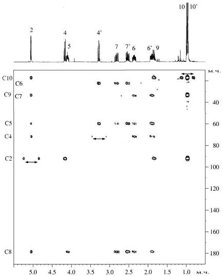 Основні принципи інтерпретації спектрів даного типу можна простежити на прикладі сигналу Н2. Насамперед слід зазначити, що в спектрі впадає в око наявність кореляції через один зв'язок з утворенням дублета при 93 м.ч. Вона повністю еквівалентна кореляції, яка показана на рис. 6.33 і може служити для ідентифікації даного сигналу, хоча в ряді випадків таке розщеплення може ускладнити картину. Можливість появи таких піків завжди слід враховувати при інтерпретації даних спектрів. Далі відзначаємо наявність кореляцій із С4, С5 і С8, що пов'язані з передачею розщеплення через гетероатоми (N і О). Такі взаємодії можуть бути особливо цінними за відсутності протон-протонних взаємодій. Нарешті, слід зазначити, що Н2 дає кореляцію з вуглецевим атомом С8. Цей центр виявляється невидимим в експериментах по кореляції через один зв'язок. Можливість спостерігати цим методом непротоновані вуглецеві центри дозволяє не тільки визначити їхні хімічні зсуви, але й одержати виключно цінні дані по зв’язаності атомів. Сьогодні комбінація COSY, HMQC/HSQC і потім НМВС є стандартним методом знаходження зв’язаності атомів в малих органічних молекулах.