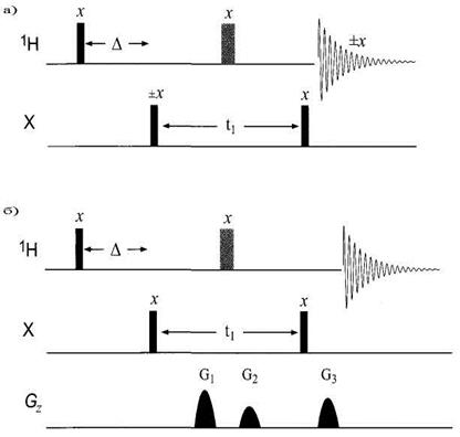 Рис. 6.47.Послідовність HMBC (a) без і (б) з імпульсними градієнтами поля. Послідовність близька до експерименту HMQC і використовує той самий шлях перенесення когерентності.