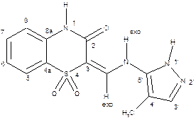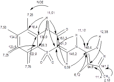 Дані, що зведені у таку таблицю, аналізувати набагато простіше, ніж ті, що є у самому двомірному спектрі, хоча, звісно, вони є ідентичними. Відсутність кореляції HMQC для якогось протонного сигналу свідчить про те, що даний протон сполучений не з атомом вуглецю. Таку ситуацію ми бачимо в Табл. 6.8 для сигналів протонів NH в області 11-12,5 м.ч. Найбільш зручно проводити віднесення сигналів, якщо накреслити структурну формулу сполуки і поступово записувати біля магнітних ядер величини хімічних зсувів, що їм відповідають, дістаючи їх з отриманих кореляцій. Перш за все, відносять протоновані атоми вуглецю, оскільки зробити це набагато легше. Після цього починають віднесення четвертинних атомів вуглецю. Найважливіші кореляції НМВС доцільно показувати викривленими стрілками. Починати віднесення слід з сигналів, що відповідають найбільш простим структурним фрагментам. Так, базуючись на віднесеному сигналі протона 1NH можна знайти хімічні зсуви близьких до нього четвертинних атомів С2, С3, С4а, С8а. На початку аналізу отримані у такий спосіб величини хімічних зсувів не слід вважати кінцевими, оскільки треба, щоб знайдені віднесення узгоджувались зі всіма знайденими кореляціями. Результат віднесення для сполуки 6.12 наведено на схемі. Тут кореляції HMQC не показані, а стрілками позначено лише кореляції НМВС, що послужили основою для віднесення сигналів четвертинних атомів вуглецю