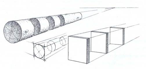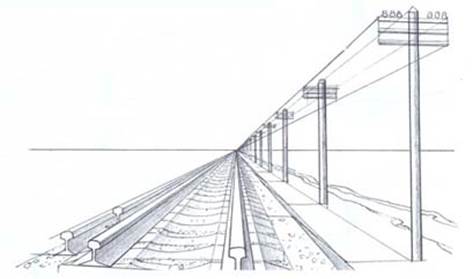 Железная дорога, по мере ее удаления, воспринимается нами в сокращенном виде, на линии горизонта сходится в точку или совсем исчезает. Так же и столбы, удаляясь, выглядят все меньше и меньше, постепенно исчезая из поля зрения. При этом мы знаем, что в действительности перед нами параллельные линии, которые никогда не сходятся. Аналогичному кажущемуся сокращению и изменению подлежит все, что мы видим в окружающем нас мире: предметы, вещи и явления. Если рассмотреть длинную доску, то по всей ее длине мы обнаружим кажущееся сокращение, причем сокращение формы доски видится по всему размеру сечения. Обратите внимание на столы, мебель, стулья. Все они подчинены одному закону, который называется перспективным сокращением форм в пространстве.