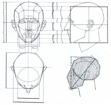 Форма головы образуется двумя ее составными частями: черепной коробкой и лицевой частью. Их пропорциональные отношения в объемной массе составляют примерно 1:2, если брать за единицу измерения лицевую часть (рис. слева). Пропорции головы рассматривается по линейному размеру и по объему. Рассмотрим размеры головы в трех измерениях: фронтальном (спереди), профильном (сбоку) и горизонтальном (сверху). При рассмотрении головы в фас ее высота по отношению к ширине составляет примерно 1:1,7. Линия глаза служит серединой высоты головы без учета волосяного покрова. Лобные бугры делят лобно-теменную поверхность по вертикали (от надбровных дуг до теменной части головы) с отношением 1:1. Расстояние между скуловыми костями соответствует высоте лицевой части, т.е. от основания подбородка до переносицы их среднепро-порциональная величина составляет примерно 1:1. Высота головы по отношению к диагонали головы составляет примерно 1:1,8. На виде сверху (в плане) показаны соотношения величин лицевой части по отношению к наибольшей ширине затылочной - 1:1,7. Ширина головы по отношению к ширине профильной части головы составляет примерно 1:1,7; 1:1,8.