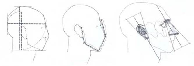Высота лицевой части головы делится на три равные части. Первая - от основания кончика подбородка до основания носа; вторая - от основания носа до надбровных бугров; третья - от надбровных бугров до середины лобных костей или на полтора-два пальца выше лобных бугров.
