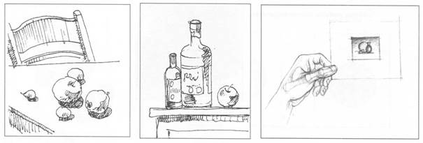 Отсутствие достаточной информации о предмете изображения и о его расположении, пропорции и других изобразительных моментах в процессе рисования чревато лишь срисовыванием или механическим переносом предметов постановки на бумагу. Постановка предметов, включенных в композицию, может быть не совсем удачной. В одном случае они могут располагаться слишком близко друг к другу или быть одинаковыми в размерах, в другом - плохо просматриваться в глубине постановки (т.е. за крупным предметом) или предмет может иметь незнакомую конструкцию и т.п. Поэтому изучение натурной постановки является непременным условием на протяжении всего учебного рисунка. Композиционная задача решается не всегда легко и просто, приходится порой затрачивать много сил и времени, особенно, когда перед нами сложная постановка. Перед тем, как сесть за ту или иную постановку, необходимо разглядеть ее со всех сторон, с учетом освещенности выявить наиболее выгодные положения (а их, как правило, немного). Поэтому следует заранее позаботиться об определении точки зрения и выборе места работы над композицией в рисунке.