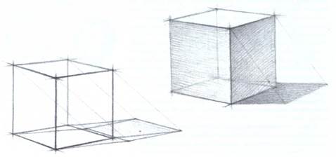 3. Уточняют пропорции и перспективное построение объемно-пространственной формы куба. Определяют границы собственной и падающей теней.