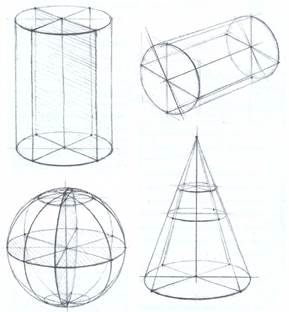 Перспективное построение окружностей подводит студентов к правильному изображению предметов, относящихся к телам вращения. Так, например, упражнения по рисованию цилиндра помогут в дальнейшем при изображении сложных по форме предметов, в которых окружность является важным составным элементом. Соблюдая методический принцип последовательности выполнения учебных задач, следует перейти от построения окружностей к построению изображения цилиндра и конуса.