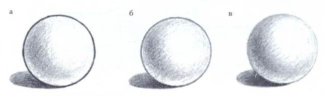 Сложность при передаче формы шара светотенью возникает в процессе выявления тональных отношений между его контуром и фоном, т.е. при создании иллюзии объемности. Контуры шара на видимом фоне должны быть нарисованы мягко и убедительно, чтобы края формы не вырывались из глубины пространства, а вызывали впечатление ее закругленности. В качестве примера приведены изображения формы шара (рис.12). Все шары выполнены в тоне в равной степени, однако воспринимаются различно. У шаров (рис.12, а,б) чрезмерно усилены края формы, на рис.12,в - края формы умеренно подчинены ей.