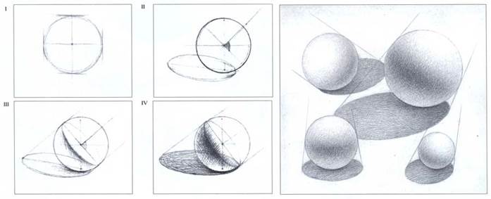 Сложность объемного построения шара тоном связана с богатством светотеневых колебаний (градаций светотени) на его поверхности по сравнению с другими телами, что обусловлено не только характером сферической поверхности, но одновременно и степенью освещенности. Освещенная поверхность постепенно убывает, огибая круг, переходя от света к тени - к увеличивающимся границам собственных теней и на затененный участок шара, где тон постепенно высветляется рефлексом и мягко переходит из одной тональности в другую - к падающей тени. Падающая тень темнее собственной, особенно у его основания.