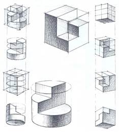 Линейно-конструктивное построение шара не представляет особой сложности, значительно сложнее выявить его форму светотенью. На рис.11 наглядно показаны приемы и методы построения шара с двумя и более образующими, поэтому останавливаться на них нет необходимости.