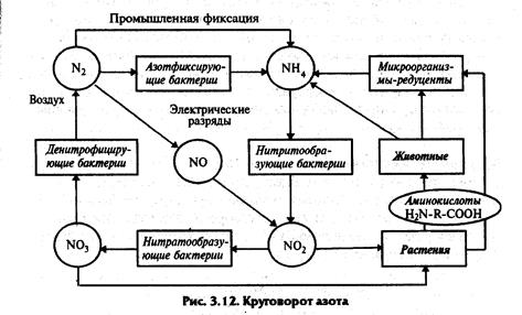 Основная часть атомов азота находится в воздухе, который на 78 % процентов состоит из одноименного газа (N2). Азот входит в структуру всех белков и вместе с тем является наиболее лимитирующим из биогенных элементов. Однако растения не могут усваивать его непосредственно; для этого азот должен входить в состав ионов аммония (NH4+) или нитрата (NН3-). К счастью, некоторые бактерии и ряд сине-зеленых водорослей (цианобактерий) способны превращать газообразный азот (N2) в аммонийную форму в ходе так называемой азотфиксации. Энергия химической связи в молекуле N2 очень велика. Поэтому соединение азота с другими элементами или водородом (процесс азотфиксации) требует больших затрат энергии. В экосфере фиксация азота осуществляется несколькими группами анаэробных бактерий и цианобактерий при нормальных температуре и давлении, благодаря высокой эффективности биокатализа. Непосредственный продукт биофиксации — аминогруппа NН2- включается в круговорот, в котором участвуют уже все организмы, но главную роль играют еще три группы почвенных и водных бактерий: нитрифицирующие, нитратобразующие и денитрифицирующие бактерии. Продукты первых двух (нитрит и нитрат) вместе с аммонием составляют основу азотного питания растений, грибов и большинства других микроорганизмов, которые образуют аминокислоты, пептиды и белки. Проходя через обмен веществ на всех трофических уровнях, эти соединения разлагаются с освобождением NH4+, и цикл повторяется. Денитрофицирующие бактерии переводят избыток нитратов в молекулярный азот.